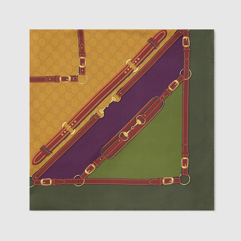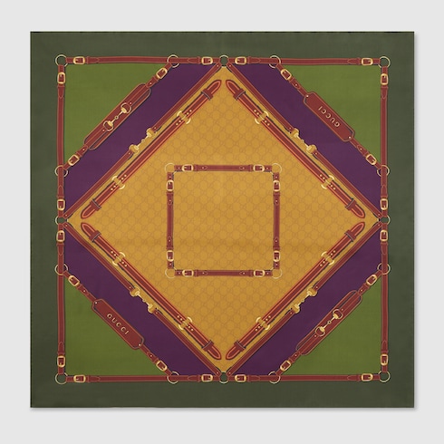 In the Fall Winter 2025 collection, the House celebrates its roots, including this silk carré with an allover Gucci belts and Horsebit print.