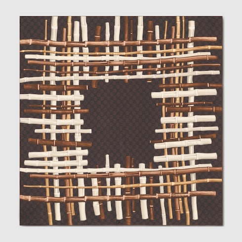 The Cruise 2026 women's silk accessories collection reimagines archival motifs with innovative prints. Presented in a silk twill, this carré reveals an allover GG bamboo print.