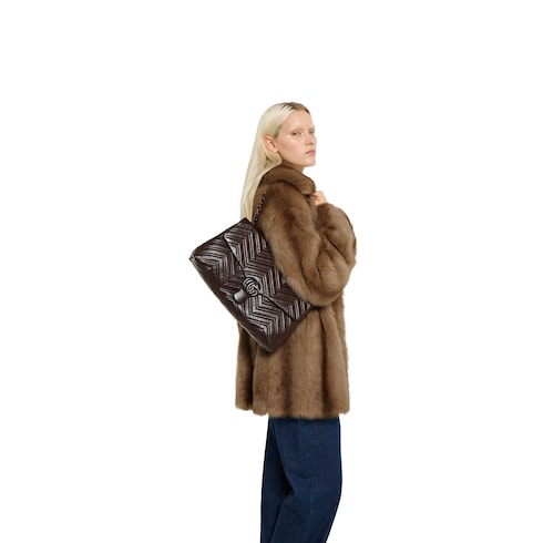In the Fall Winter 2025 collection, the GG Marmont, a signature collection of the House, features the emblematic Double G, a faceted chain strap, and a soft, structured silhouette. This style is crafted from soft lightweight matelassé chevron leather and comes with a tonal enameled hardware and chain.