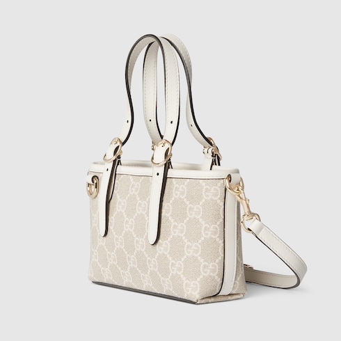 The GG Emblem collection introduces contemporary silhouettes in the women's small leathergoods, ideal for carrying daily essentials. This beige and white mini bag is crafted from the GG Monogram coated fabric. Featuring a white leather trim, the design comes with a detachable and adjustable leather shoulder strap.
