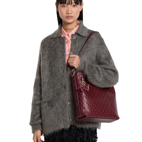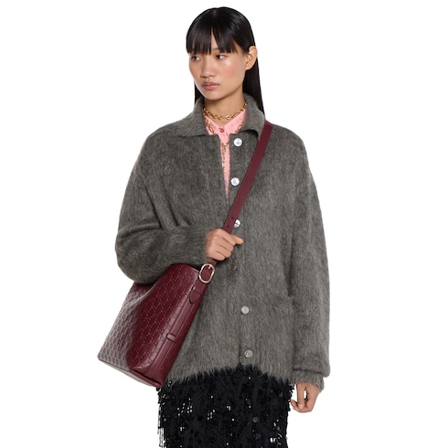 In the Fall Winter 2025 collection, the GG Emblem collection reinterprets the House’s history of elegance and craftsmanship. This bucket bag highlights functional design with an interior compartment, in matching cotton lining.