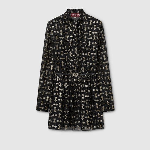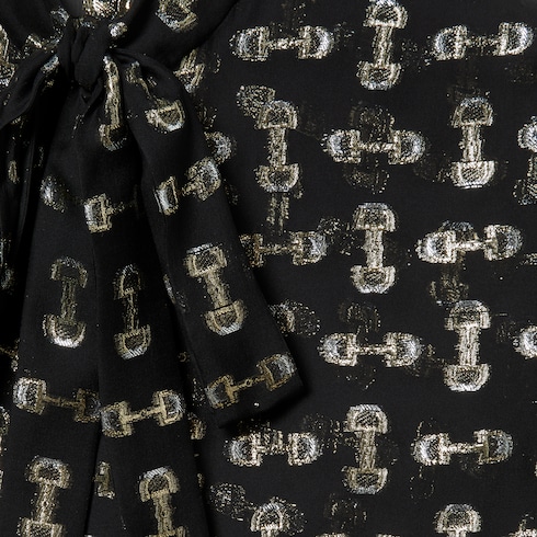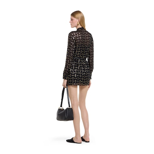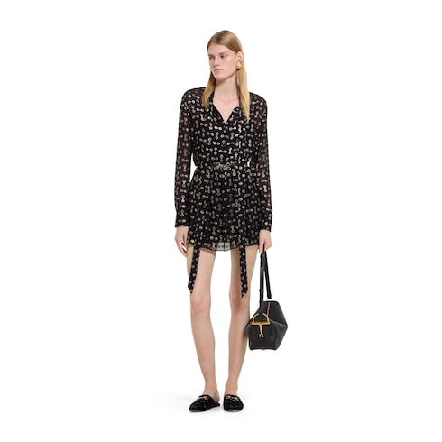 The Cruise 2026 women's ready-to-wear collection highlights sumptuous materials on essential silhouettes to usher in the festive season. Crafted from black Horsebit silk fil coupé, this dress is enriched with a detachable leather belt and a self-tie ribbon detail.