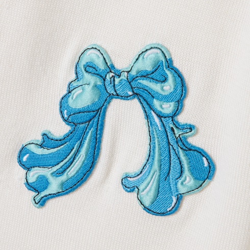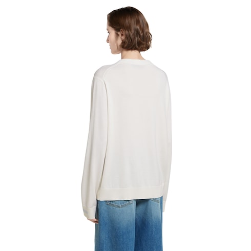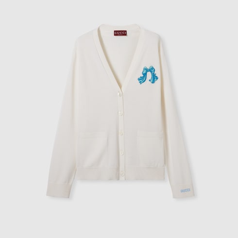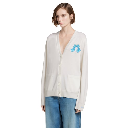 In the Pre-Fall 2025 collection, Korean artist Inji Seo‘s whimsical motifs adorn women’s ready-to-wear and small leathergoods. Crafted from ivory extra fine wool, this cardigan features an embroidered patch and a Gucci intarsia.