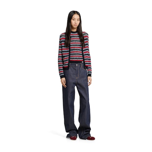 Perfect for the seaside, maritime-inspired designs enrich casual silhouettes with stripes, contrasting trims and signature motifs in the Pre-Fall 2025 collection. This cardigan in striped fine cotton knit features a subtle Gucci intarsia.