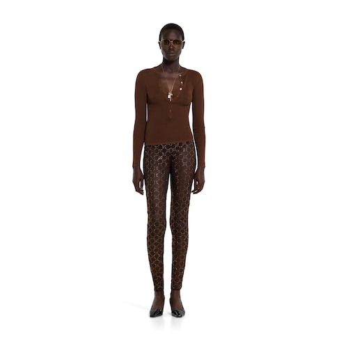 The Cruise 2026 women's ready-to-wear collection celebrates the Gucci wardrobe, blending archival influence with the history of Florence in a playful mélange, ranging from the minimal to the maximal. Crafted from light brown extra fine cotton rib, this cardigan is completed with a Gucci detail on the back.