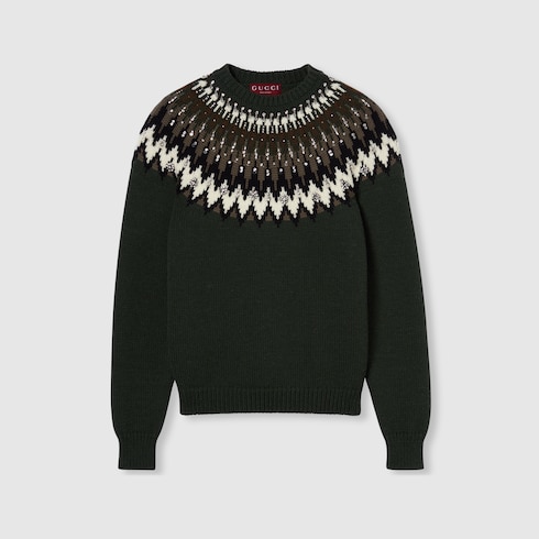 Refined shades of brown, beige, and orange echo the hues of nature's changing landscape. Versatile and timeless, the color palette is easily interspersed within an everyday wardrobe. This oversized sweater is presented in a Norwegian wool jacquard and features a crystal embroidery.