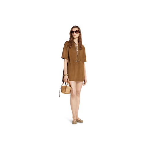 The House's heritage motifs are presented on a backdrop of sophisticated textures, from off-duty denim to lightweight canvas and refined suede, for the Pre-Fall 2025 collection. This light brown suede and leather dress has a unique lattice neckline and features a central Horsebit hardware.