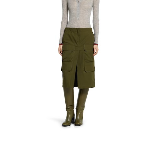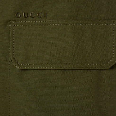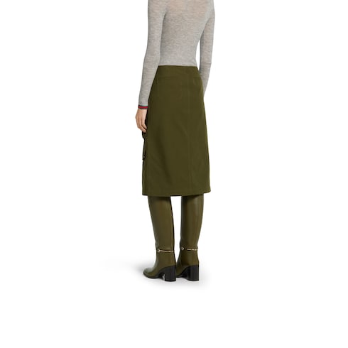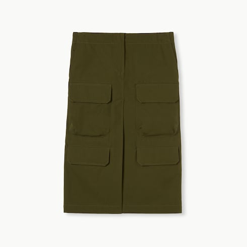 Green defines the color narrative for Pre-Fall 2025 and speaks volume with textures, logo details and varying tonalities, as seen on the runway. This light cotton canvas skirt features has a cargo style and appears in the signature forest green with a Gucci embroidery.