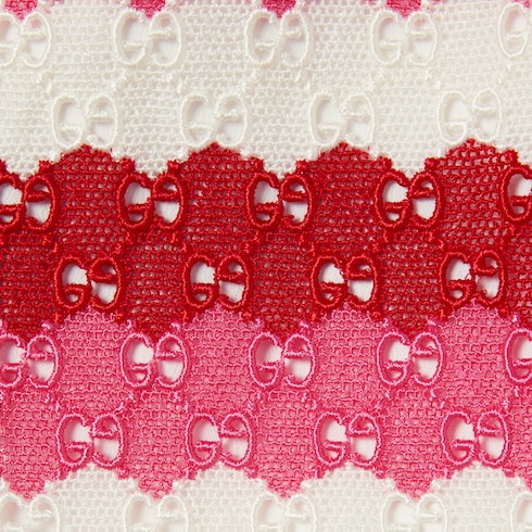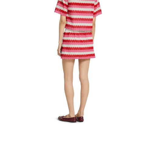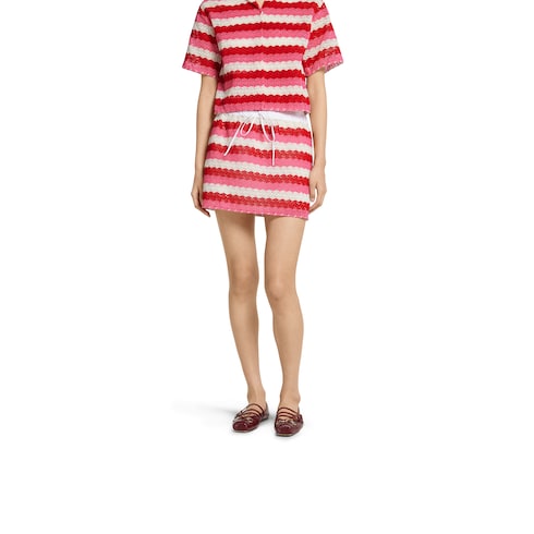 Perfect for the seaside, maritime-inspired designs enrich casual silhouettes with stripes and signature motifs in the Pre-Fall 2025 collection. This short skirt with a drawstring waist is crafted from a striped GG polyester macramé in vibrant colors.