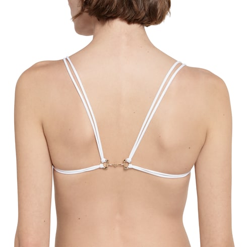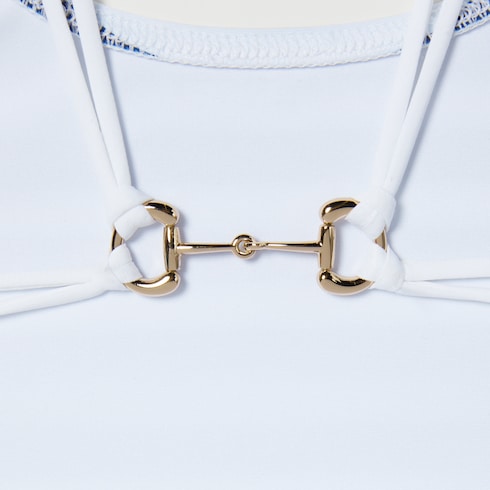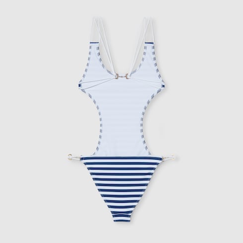 Emblematic codes of the House and refined patterns are reinterpreted in contemporary ways for the Pre-Fall 2025 collection. This stretch jersey swimsuit in vibrant colors is enriched with Horsebit hardware details.