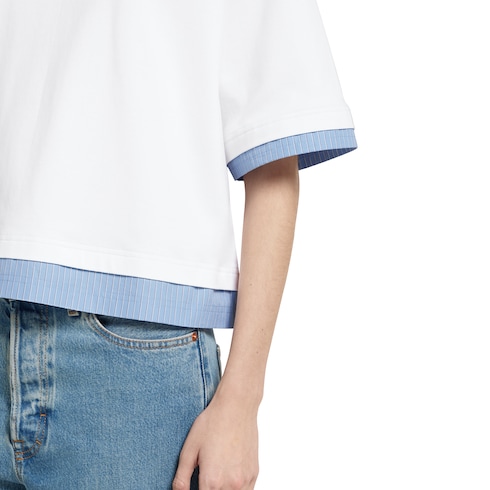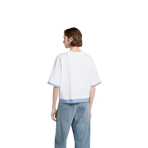 Perfect for the seaside, maritime-inspired designs enrich casual silhouettes with stripes, lightweight materials, and signature motifs in the Pre-Fall 2025 collection. This jersey T-shirt is elevated with a blue striped cotton trim.