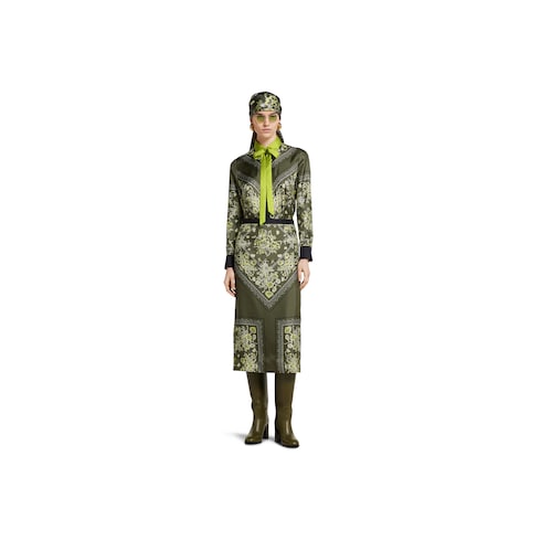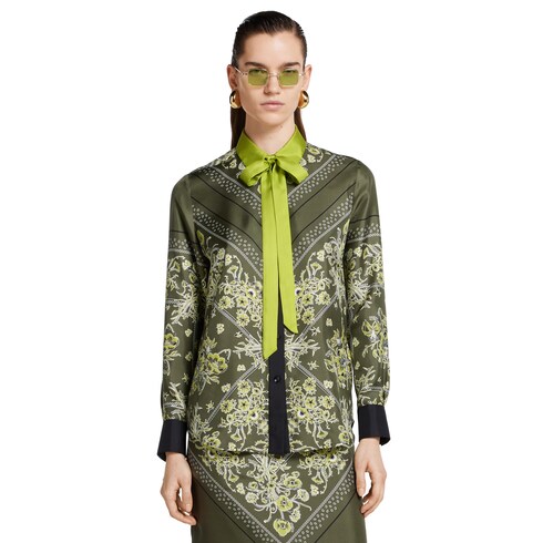 Green defines the color narrative for Pre-Fall 2025 and speaks volume with textures, logo details and varying tonalities, as seen on the runway. This silk twill shirt comes to life with an allover floral bandana print. An elegant self-tie neck bow completes the silhouette-