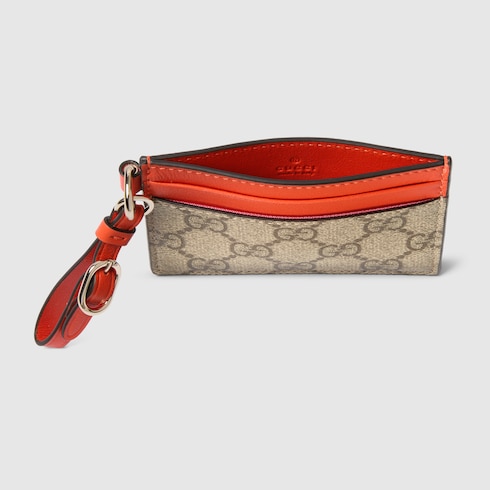 The GG Emblem collection comprises vibrant leather trims for a touch of warm weather style. This card case is presented in GG Monogram coated fabric with a contrasting leather trim.