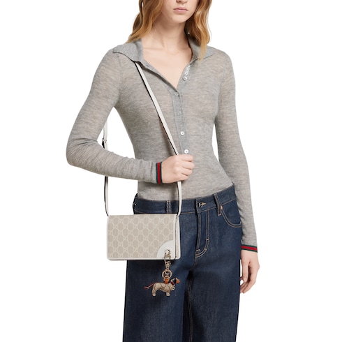 The GG Emblem collection reinterprets signature motifs through creativity and innovative functions, and is envisioned to be cherished for years to come. Introduced in the latest line of small accessories, this beige and white wallet with strap is crafted from the new GG Monogram fabric. Featuring an off white leather trim, the design comes with an embossed Gucci logo.