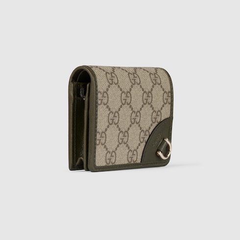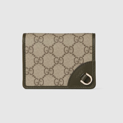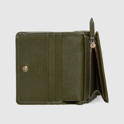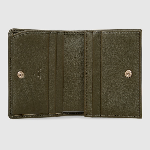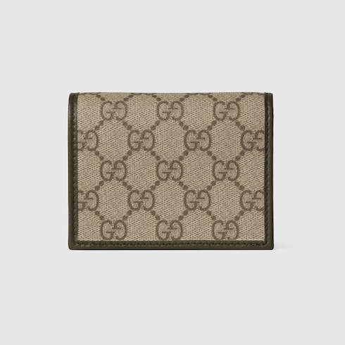 The GG Emblem collection introduces contemporary silhouettes in the women's small leathergoods, ideal for carrying daily essentials. This beige and dark brown small wallet is crafted from the GG Monogram coated fabric. Featuring a forest green leather trim, the design comes with multiple card slots.