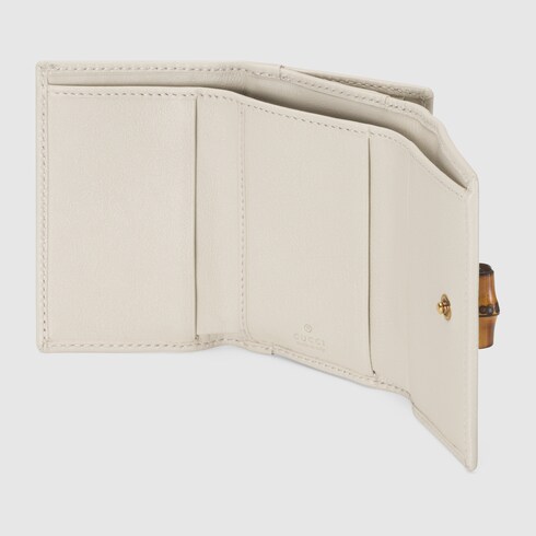 Paying homage to a material at the heart of Gucci’s heritage, this wallet is defined by its bamboo closure. Crafted from white leather, the accessory is completed by Guccio Gucci's monogram hardware.