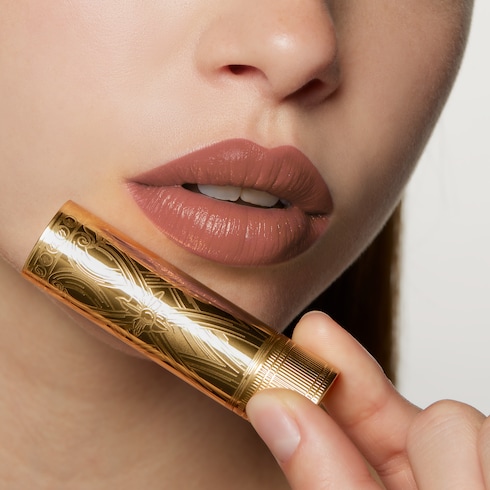 - La barra de labios, inspirada en los diseños de maquillaje vintage, se presenta en un tubo dorado grabado con un motivo decorativo de influencia Art déco.