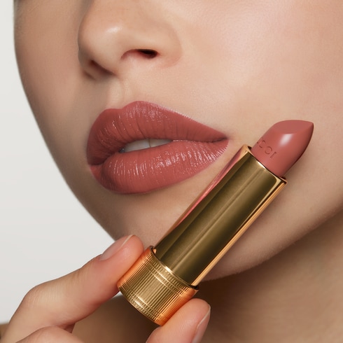 - La barra de labios, inspirada en los diseños de maquillaje vintage, se presenta en un tubo dorado grabado con un motivo decorativo de influencia Art déco.