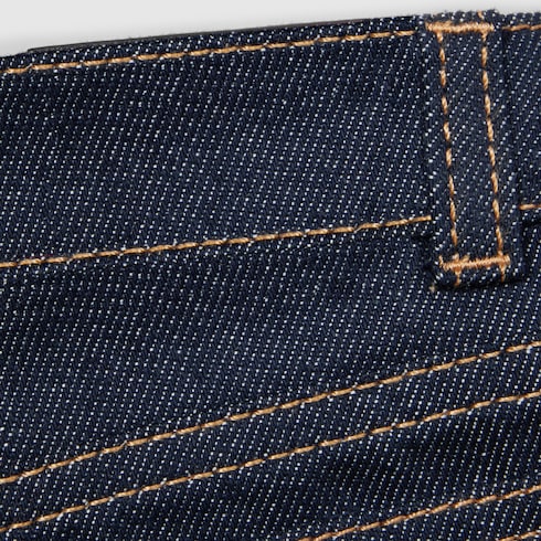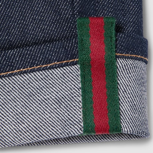 Diversas versiones de la clásica tribanda Web destacan en toda la colección infantil Pre-Fall 2025. Los adornos y ribetes rojos y verdes de las piezas ready-to-wear, zapatillas y accesorios crean una actitud deportiva, ideal para todo tipo de aventuras. Este pantalón para bebé está confeccionado en denim y se realza con un ribete con tribanda Web verde y roja.