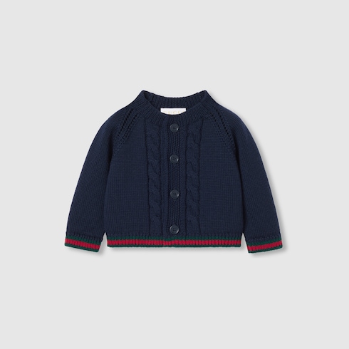Varias versiones de la tribanda Web clásica realzan la colección infantil. Los adornos y ribetes rojos y verdes de las piezas ready-to-wear, zapatillas y accesorios crean una actitud deportiva, ideal para todo tipo de aventuras. Este cárdigan para bebé se ha confeccionado en lana con un ribete con tribanda Web en contraste en los puños y el dobladillo.