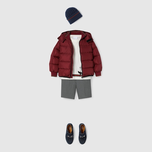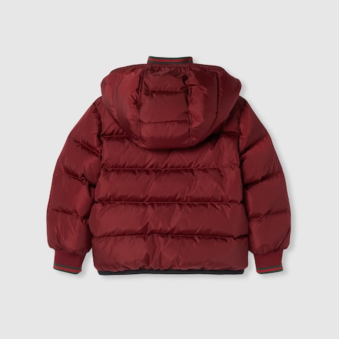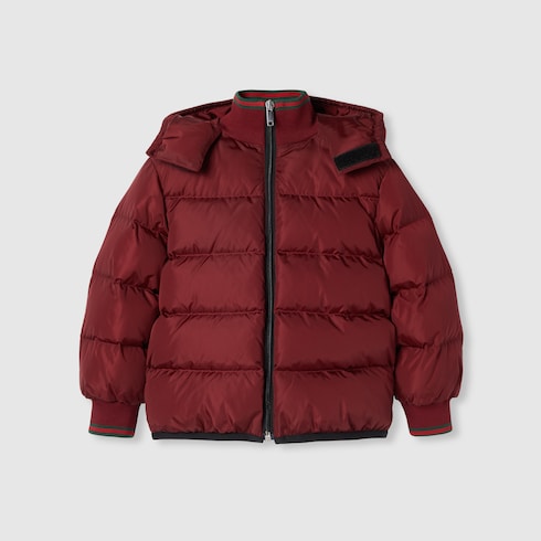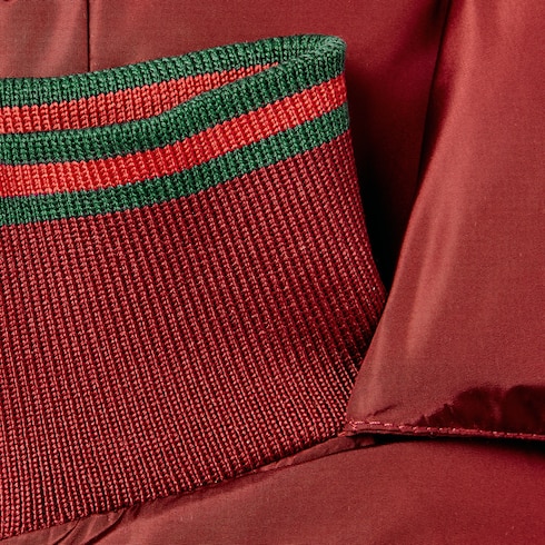 Varias versiones de la tribanda Web clásica realzan la colección infantil. Los adornos y ribetes rojos y verdes de las piezas ready-to-wear, zapatillas y accesorios crean una actitud deportiva, ideal para todo tipo de aventuras. Esta chaqueta infantil se ha confeccionado en nylon acolchado con un ribete con tribanda Web