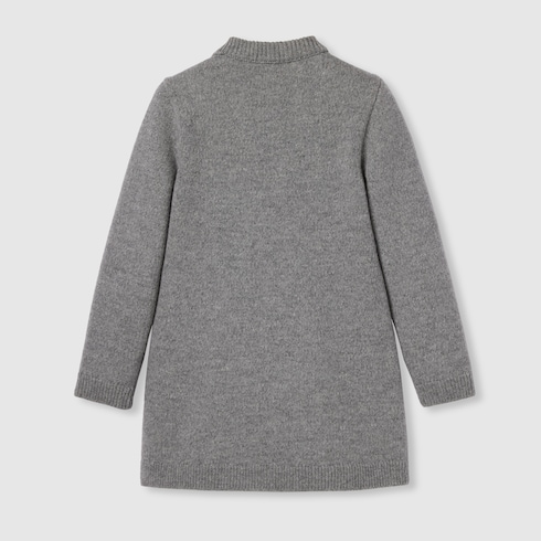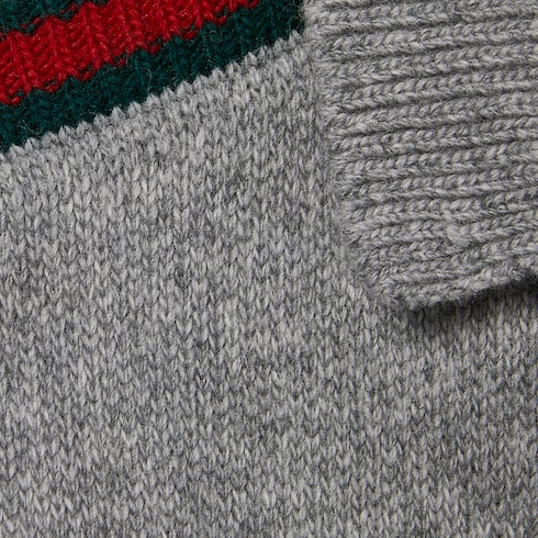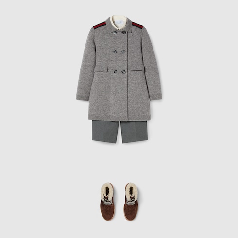 Varias versiones de la tribanda Web clásica realzan la colección infantil. Los adornos y ribetes rojos y verdes de las piezas ready-to-wear, zapatillas y accesorios crean una actitud deportiva, ideal para todo tipo de aventuras. Este abrigo infantil se ha confeccionado en lana con un detalle de tribanda Web en los hombros.