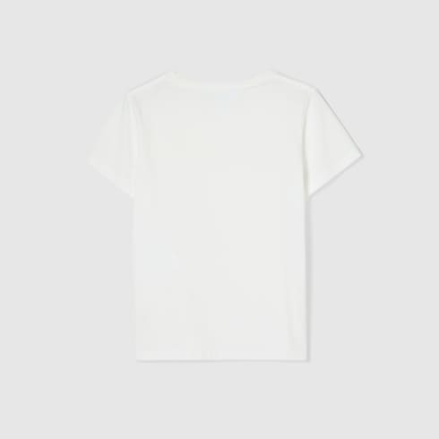 Desde sutiles bordados hasta estampados integrales, los emblemas exclusivos continúan realzando la colección infantil Pre-Fall 2025. Esta camiseta infantil se ha confeccionado en punto de algodón con un estampado Gucci con corazón.