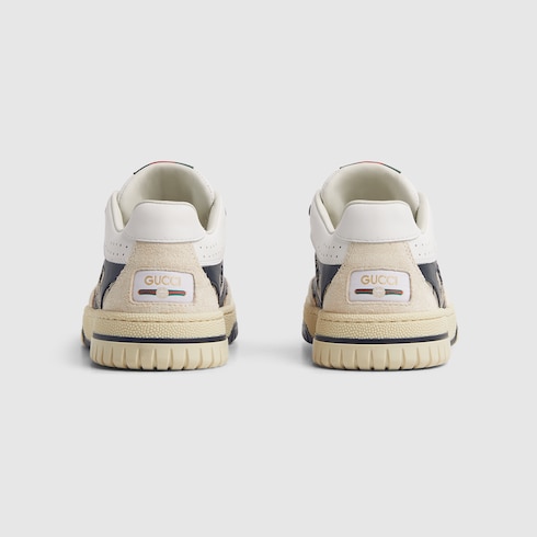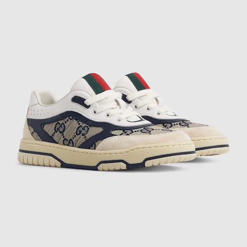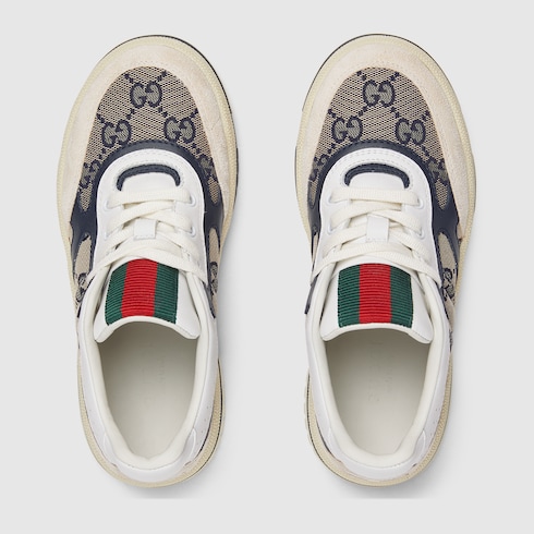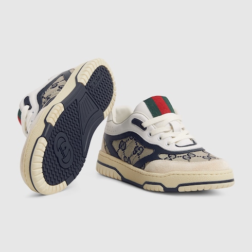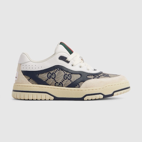 Varias versiones de la tribanda Web clásica realzan la colección infantil. Los adornos y ribetes rojos y verdes de las piezas ready-to-wear, zapatillas y accesorios crean una actitud deportiva, ideal para todo tipo de aventuras. Estas zapatillas infantiles Gucci Re-Web se han fabricado en piel blanca y lona GG beige y azul con detalles de ante en los mismos tonos.