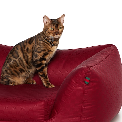 La colección Gucci Pet de Pre-Fall 2025 ha evolucionado para incluir diversos accesorios para mascotas inspirados en motivos y estampados distintivos de los looks para hombre y mujer. Esta cama para mascotas se ha fabricado en nylon con GG repelente al agua y cuenta con una trabilla con tribanda Web y una etiqueta Gucci de piel.