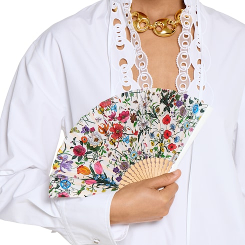 El clásico estampado Flora vuelve con la colección Pre-Fall 2025 para añadir un toque romántico. Este abanico grande se ha confeccionado en seda satinada y madera con el estampado Flora por toda la superficie. Un adorno de Doble G completa el diseño.