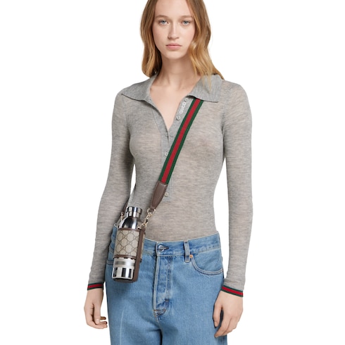 Esta botella de agua es parte de la colección Pre-Fall 2025. Se ha fabricado en acero y cubierto con un tejido revestido con monograma GG, el logotipo Gucci y una correa de lona con tribanda Web.