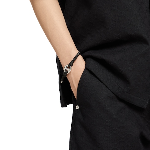 La narrativa náutica se extiende a la selección de joyería de Gucci en la colección Pre-Fall 2025, con pulseras de cuerda en varios colores y acabados que exhiben el encanto de la cadena Marina. Combine este accesorios con otras pulseras como en el desfile. Esta versión se ha fabricado en tejido negro.