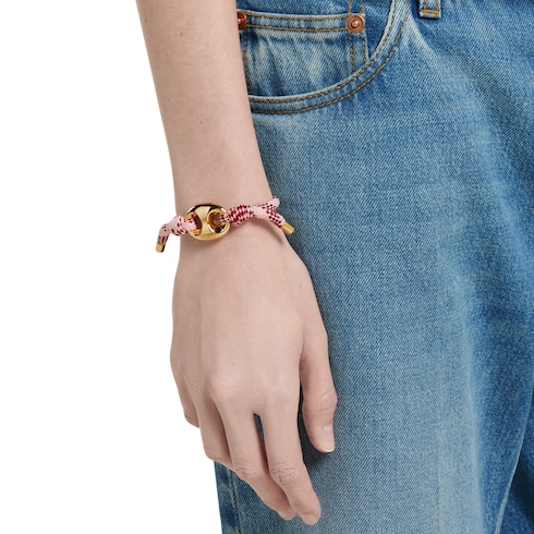 La narrativa náutica se extiende a la selección de joyería de Gucci en la colección Pre-Fall 2025, con pulseras de cuerda en varios colores y acabados que exhiben el encanto de la cadena Marina. Combine este accesorios con otras pulseras como en el desfile. Esta versión se ha fabricado en tejido rosa y multicolor.