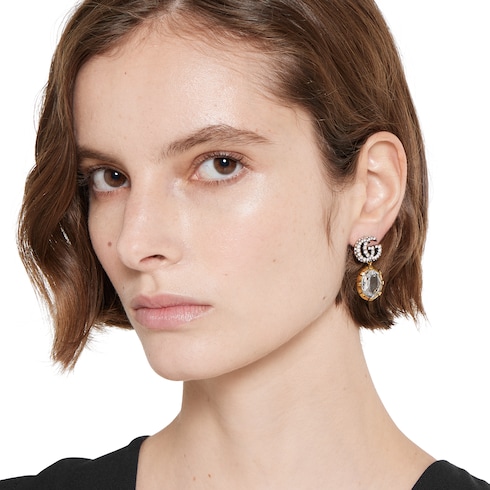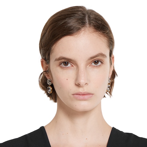 Un colgante de cristal facetado transparente se combina con el motivo GG con cristales engarzados para formar un colgante resplandeciente que completa estos pendientes de metal en color oro envejecido.