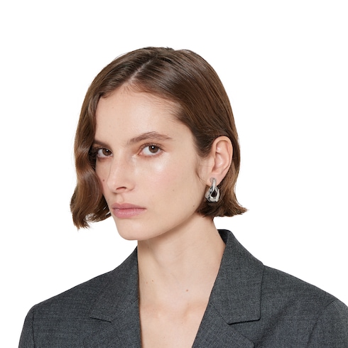 Los llamativos detalles del logotipo marcan la línea Gucci Signature en la colección Pre-Fall 2025, con collares de cadena plateados y pendientes con el motivo GG por todo el diseño. Este pendiente individual exhibe un detalle de logotipo grabado sobre un contundente diseño grueso.