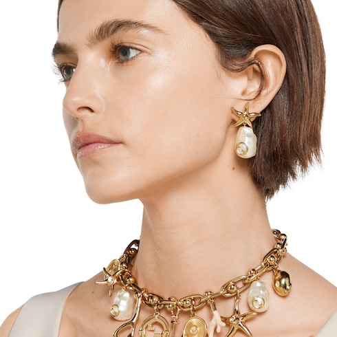 Siguiendo con la temática náutica de la selección, estos pendientes con forma de estrella de mar cuentan con colgantes de perla con la GG entrelazada redonda que se asemejan a las delicadas piezas de coral.