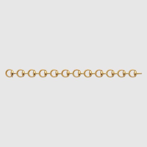 Gucci celebra el 20 aniversario de la exclusiva línea de joyas Horsebit con diseños clásicos y emblemáticos en oro amarillo de 18 quilates. Esta pulsera se realza con unos motivos Horsebit entrelazados.