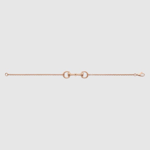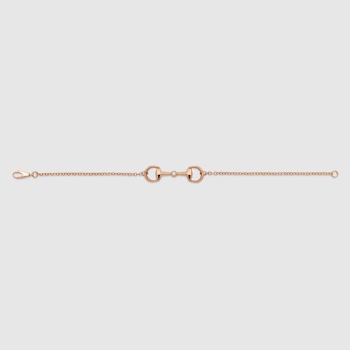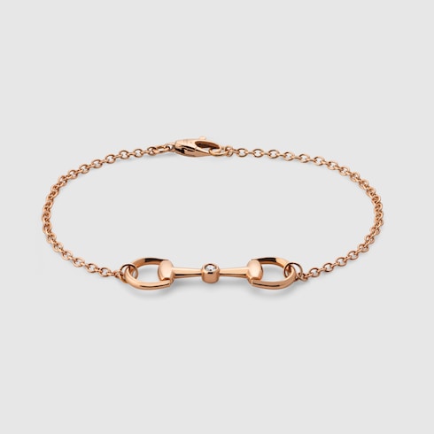 Gucci celebra el 20 aniversario de la exclusiva línea de joyas Horsebit con diseños clásicos y emblemáticos en oro rosa de 18 quilates con diamantes. Esta pulsera de cadena Horsebit se realza con un resplandeciente diamante blanco en el centro.