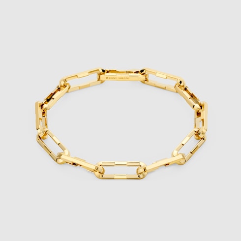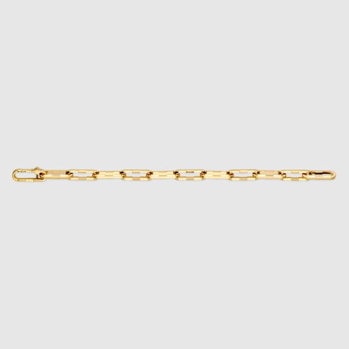 La colección Gucci Link to Love explora el romanticismo contemporáneo y cuenta con nuevos símbolos del amor. Esta pulsera con una cadena ancha de eslabones geométricos en oro amarillo laminado de 18 quilates es un diseño que ofrece múltiples posibilidades de estilo.