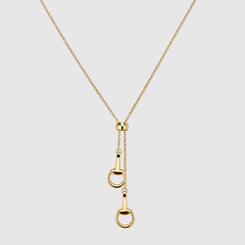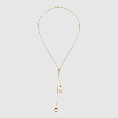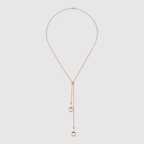Gucci celebra el 20 aniversario de la exclusiva línea de joyas Horsebit con diseños clásicos y emblemáticos en oro amarillo de 18 quilates. Este collar de cadena se realza con dos colgantes Horsebit.