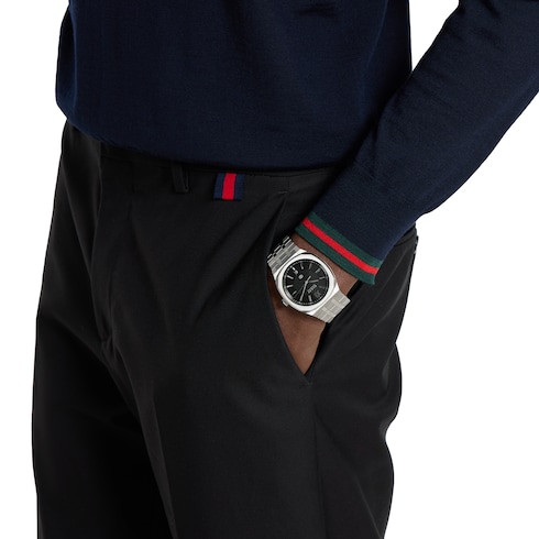 La nueva colección GUCCI 25H presenta una silueta estilizada, con elementos refinados que mejoran el diseño elegante del reloj. Este modelo con movimiento automático se realza con una correa de acero intercambiable y una caja de acero inoxidable con esfera negra.