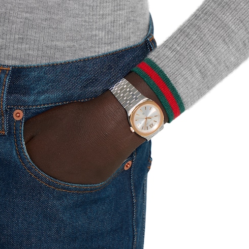 La nueva colección GUCCI 25H presenta una silueta estilizada, con elementos refinados que mejoran el diseño elegante del reloj. Este modelo de cuarzo se realza con una correa de acero intercambiable y una caja de acero inoxidable con bisel en tono dorado rosa.
