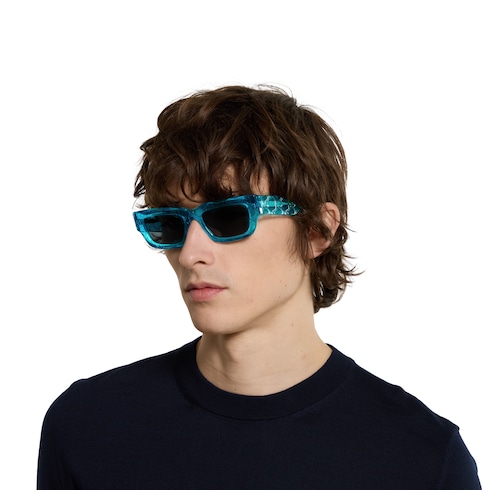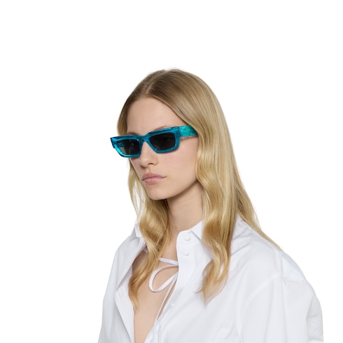 La colección de gafas Pre-Fall 2025 cuenta con diseños contemporáneos que combinan una estética elegante y motivos exclusivos. Estas gafas de sol rectangulares presentan un motivo GG por toda la montura y las patillas de acetato en azul claro.