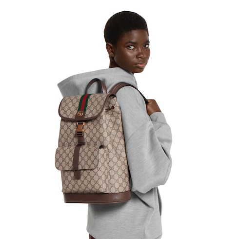 Los diseños Ophidia en beige y marrón oscuro aportan suavidad a modelos exclusivos e innovadores. Esta mochila se ha fabricado en un tejido revestido con monograma GG y se realza con un detalle de Doble G y una tribanda Web.