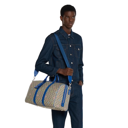 Esta bolsa de viaje forma parte de la colección Pre-Fall 2025. El tejido revestido con monograma GG se realza con un estampado integral multicolor y un ribete del mismo color que el resto del diseño.