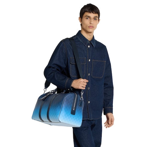 El estampado con efecto degradado en el refrescante tono azul aporta un toque de luz a varias piezas esenciales. Esta bolsa de viaje se ha confeccionado en un tejido revestido con monograma GG y un estampado GG degradado por toda la superficie.