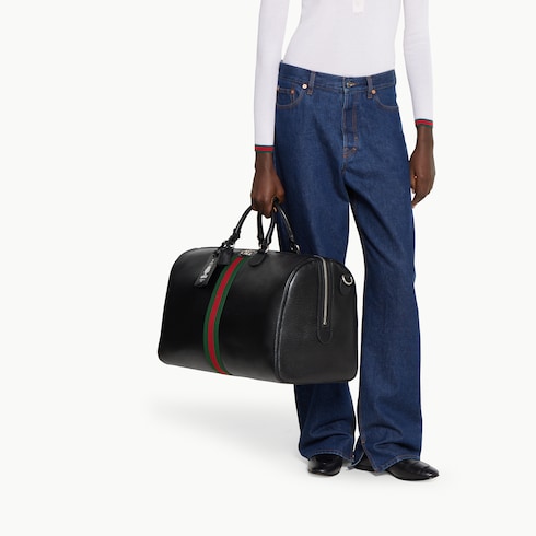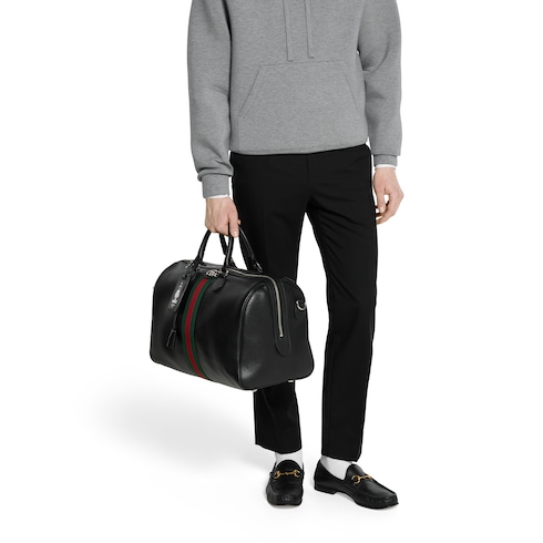 Los diseños Gucci Savoy de sofisticada piel negra realzan modelos exclusivos. Esta bolsa de viaje se ha fabricado en piel suave con brillo natural y exhibe un detalle de Doble G y tribanda Web.