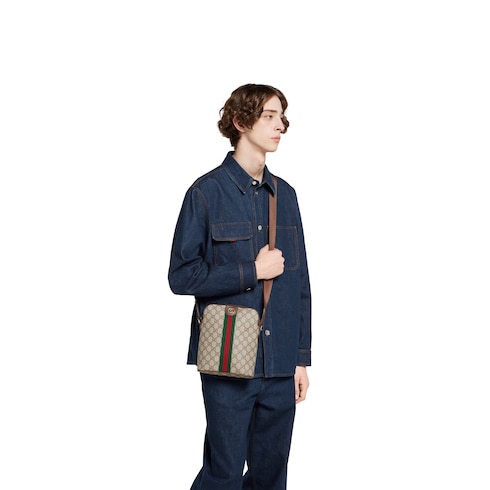 Los diseños Ophidia en beige y marrón aportan suavidad a modelos exclusivos e innovadores. Esta bandolera se ha fabricado en un tejido revestido con monograma GG y se realza con un detalle de Doble G y una tribanda Web.