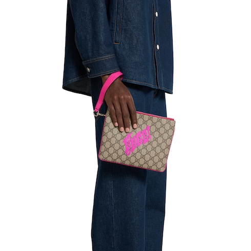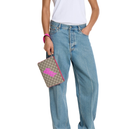 El artista chino Currynew (Xiang Zhang) aporta su toque personal al logotipo de la Firma en la selección de prendas ready-to-wear, artículos de marroquinería y accesorios de la colección Pre-Fall 2025. Esta cartera neceser está confeccionada con un tejido revestido con monograma GG, un estampado Gucci y un ribete de piel en contraste.