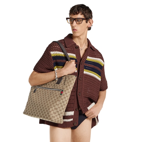 La lona GG rinde homenaje al inconfundible monograma del fundador Guccio Gucci. Este bolso tote resulta el complemento perfecto para el día a día, ya que cuenta con un detalle de tribanda Web verde y roja y un ribete de piel en marrón oscuro.